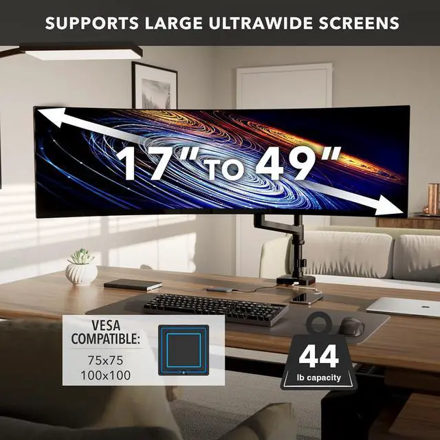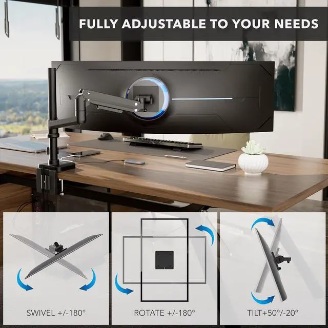 Full Motion Adjustability for Perfect Viewing Achieve ergonomic comfort with tilt (+50°/-20°), swivel (+/-90°), 360° rotation, and gas spring-assisted height adjustment. Customize your 49 inch monitor arm setup for gaming, work, or multitasking with ease.