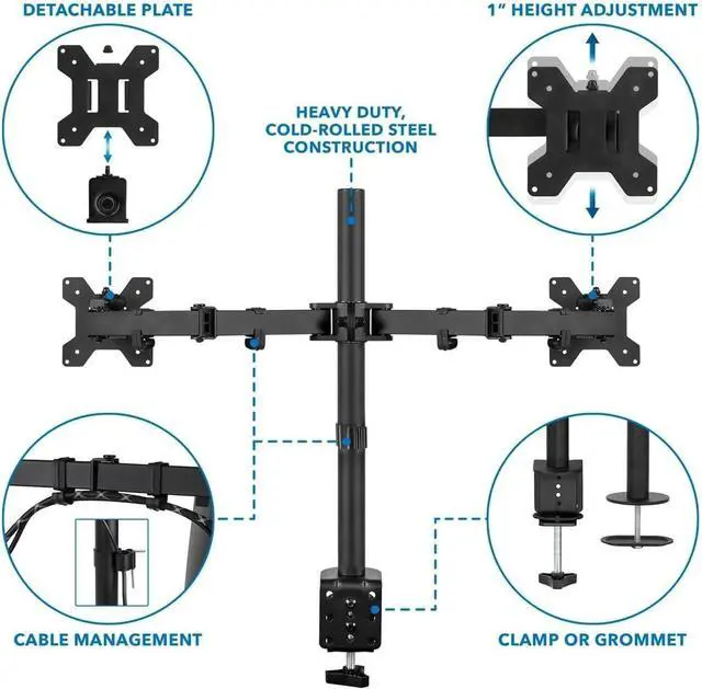 Full-motion, height adjustable arms made of heavy duty steel and include integrated cable management clips