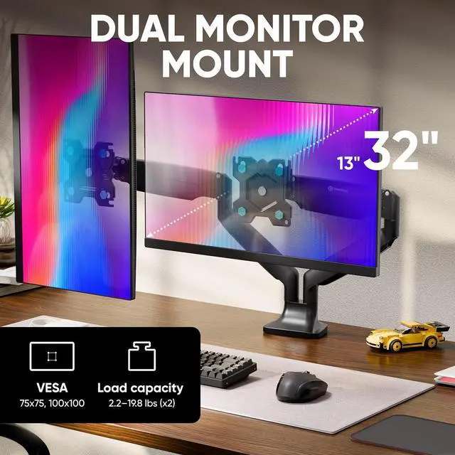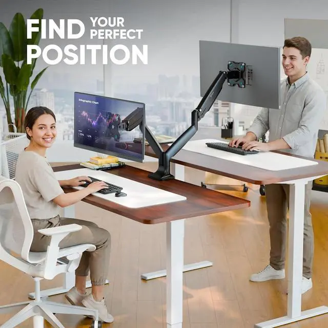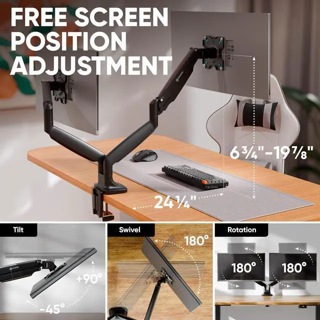 FULL MOTION MONITOR MOUNT DESK | Monitor stand for desk has an up-down tilt -90° - +45°, left-right swivel 180° and 360° rotation | Rotate monitor desk mount into landscape or portrait mode, fix double monitor stand in any position on your eye level | Double monitor arm is ideal for those who need dual monitors : designers, streamers, programmers, etc.