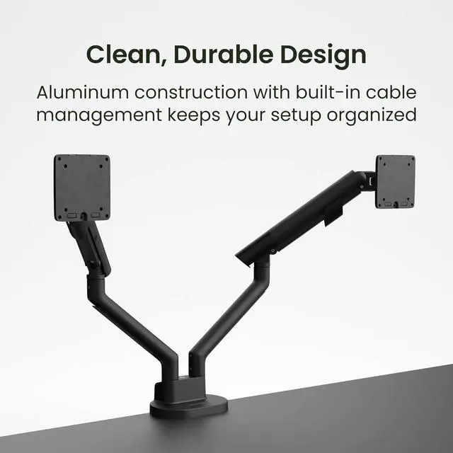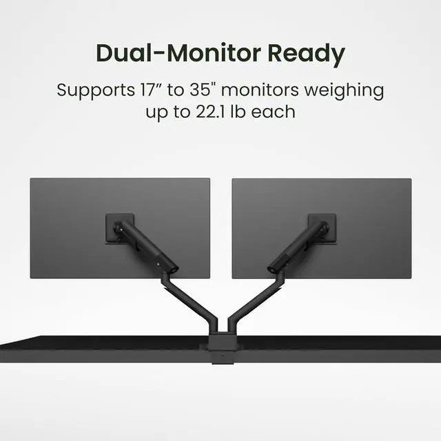 Designed to support modern flat, curved, and ultrawide monitors from 1735 up to 22.1 lb (10 kg) each, DM2 works seamlessly with VESA patterns 75x75 mm to 100x100 mm. This dual monitor arm provides stable, flexible support, letting you set up your workspace comfortably and confidently.