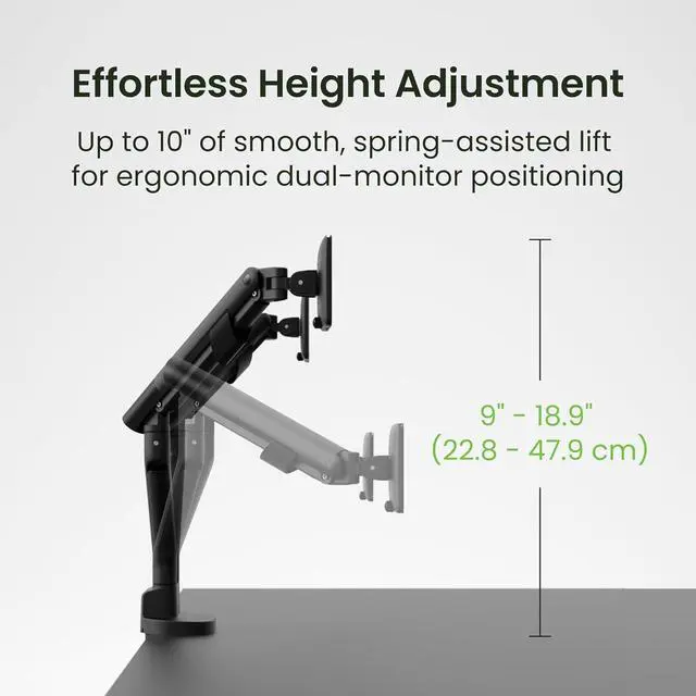 Achieve optimal ergonomics with up to 10 of smooth, spring-assisted vertical lift. DM2s tension-adjustable arm lets you intuitively raise, lower, and reposition your monitors, reducing neck strain and helping you stay productive throughout the day.