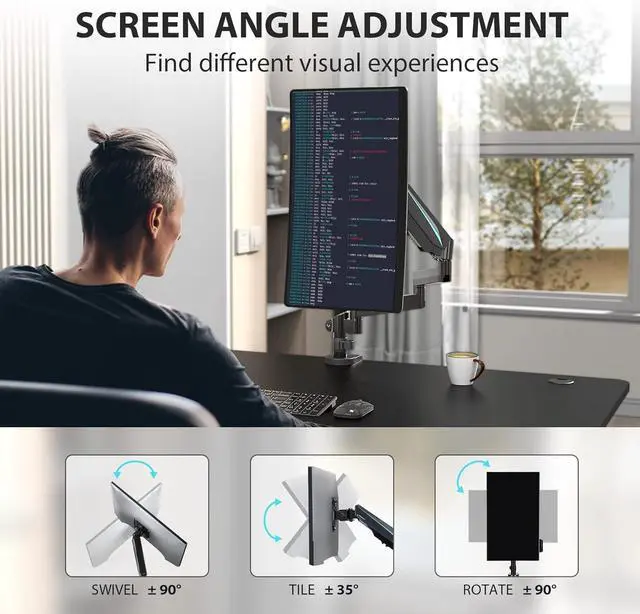Full Motion Adjustment: Adjustable monitor arm supports +35° to -35° tilt; 180° swivel; 360° rotation freely place your monitors in landscape or portrait mode. Help to find the optimal viewing angles and comfortable ergonomic position for efficient work. Perfect for home office work or gaming