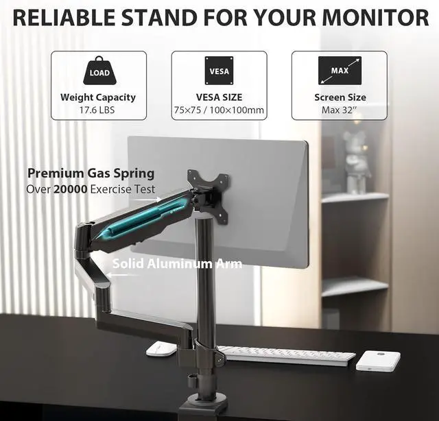 Sturdy Construction: Features premium gas spring system; Made of solid aluminum with a black finish; Pass 20,000 cycle test for lengthy lifespan; Extremely strong to ensure stable and secure support of your monitors without worrying about it slipping down. Integrated cable management helps hide the clutter of wires; Release more desk space for organized workstation and better workflow