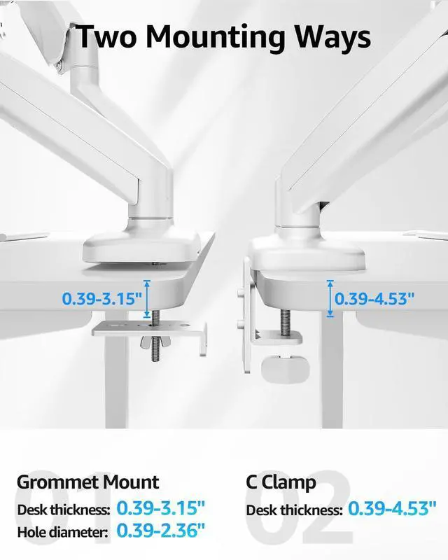 Quick Installation - Easy assembly with the C-clamp or grommet base. The C-clamp fits the desktops 0.39" - 1.97" thick and the grommet mounting fits the desktop 0.39" - 3.15" thick with a bolt-through hole 0.39" - 2.36". The wider C-clamp is available on request ,which fits up to 3.34" in thickness.