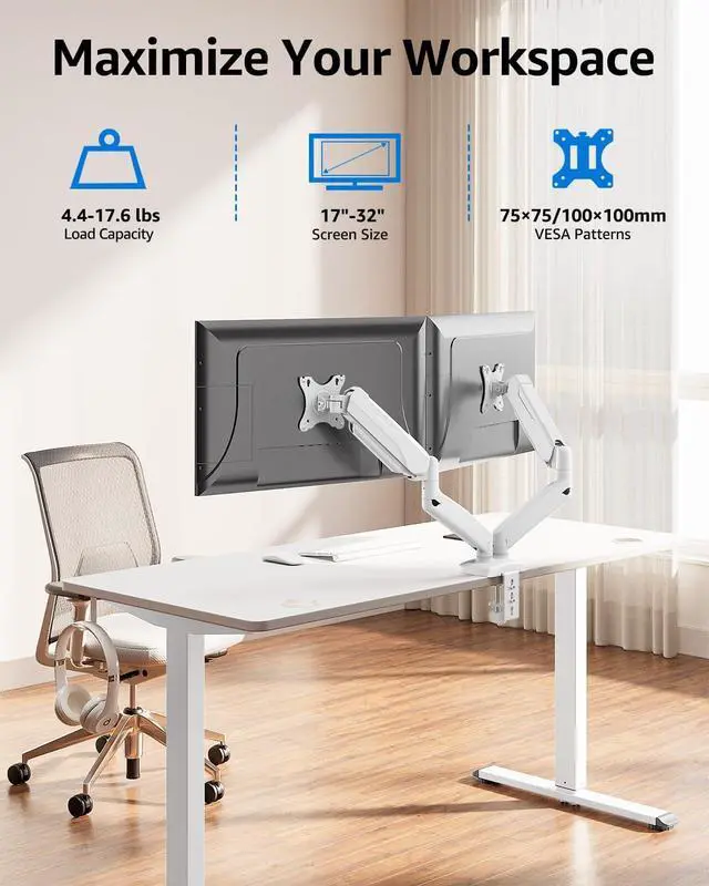 Universal Monitor Desk Mount - The dual monitor mount fits screens 4.4lbs - 17.6 lbs in weight and 13-32 inches diagonal; compatible with VESA patterns 75x75 mm and 100x100 mm. Double-monitor users need a break, too. Let's not let the strain be in the neck and back regions of the body. Enjoy the benefits of monitors that float above your desk and see how much space and productivity you can gain.