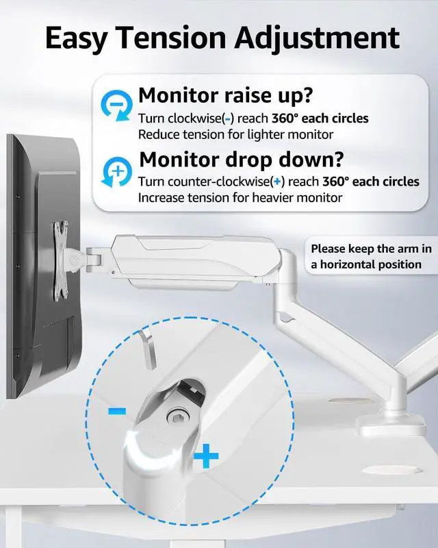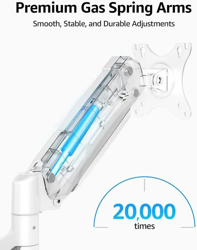 Premium Gas Spring Arms - Extensive quality testing ensures your computer monitors stay stable and secure. The monitor arm offers full monitor movement with 19.9" of arm extension and 9.4'' of height adjustment range. The dual monitor arm with a gas spring system provides smooth and durable adjustments. Please adjust the tension of the gas spring arm properly according to the weight of your monitor.