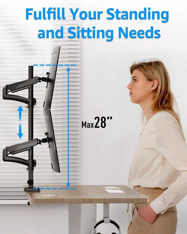 Stacked Monitor Mount-Hold up to max dual 32" monitors. Each arm can hold 4.4 Ibs-17.6 Ibs (2-8kg) monitor with 75mm x75mm or 100mm x 100mm VESA mounting holes.