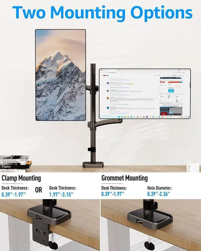 Space Saving-Dual monitor installation with cable management hides arm wires and frees up more desktop space to accommodate two monitor arms. Enjoy your work, gaming or viewing time in a more comfortable environment!