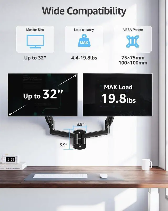 Universal Monitor Wall Mount - The dual monitor wall mount fits most flat or curved computer screens up to 32", each arm holds 4.4-19.8lbs, support pc display with VESA pattern 75x75mm and 100x100mm. Designed for wood studs, brick, and concrete walls. NOTE: Not for dry wall alone application.