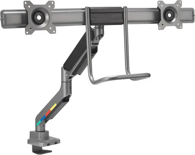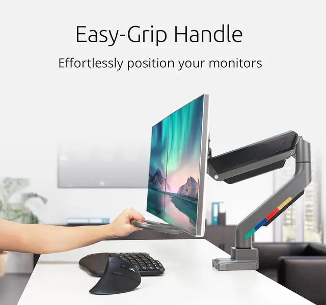 Effortless adjustment of two monitors: position two 19-32" monitors weighing up to 20 pounds each effortlessly with handle and gas spring mechanism that provides smooth height and angle changes for optimal ergonomic comfort