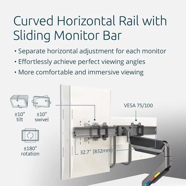 Adjustment with easy-grip handle: horizontal rail with a sliding monitor bar for separate horizontal adjustment for each monitor, easy to grip handle provides effortless positioning for the perfect viewing angle