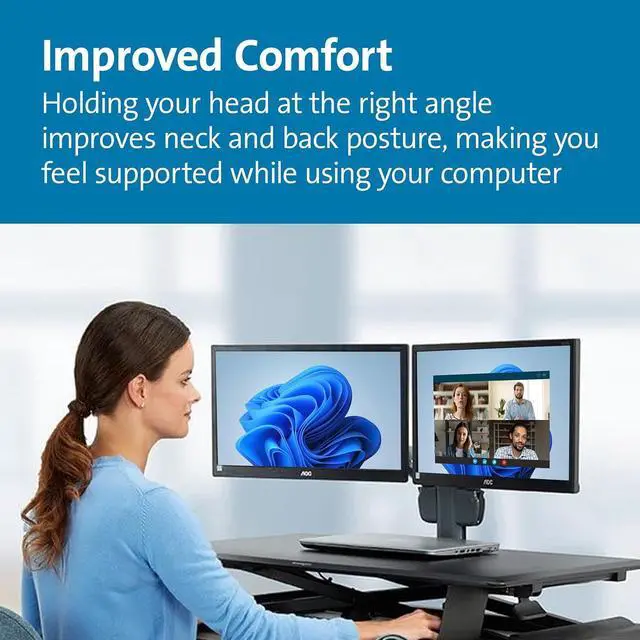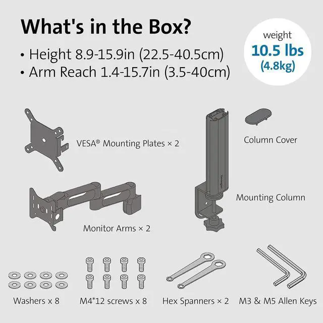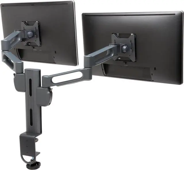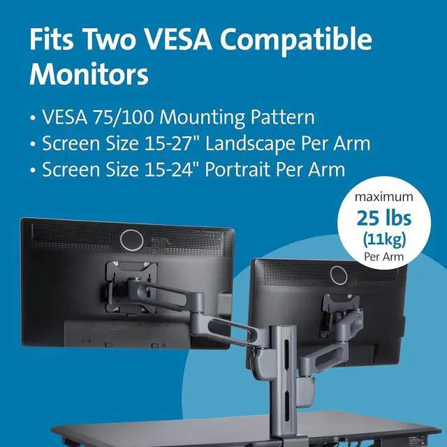 Monitors attach via 75mm or 100mm VESA-compatible mounts