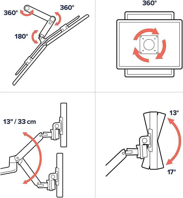 Large range of motion: Offers full monitor movement with 13 inches of lift, rising 20.6 inches from the desktop; delivers 25 inches of extension; personalize your view with 360 degrees of rotation and 30 degrees of tilt