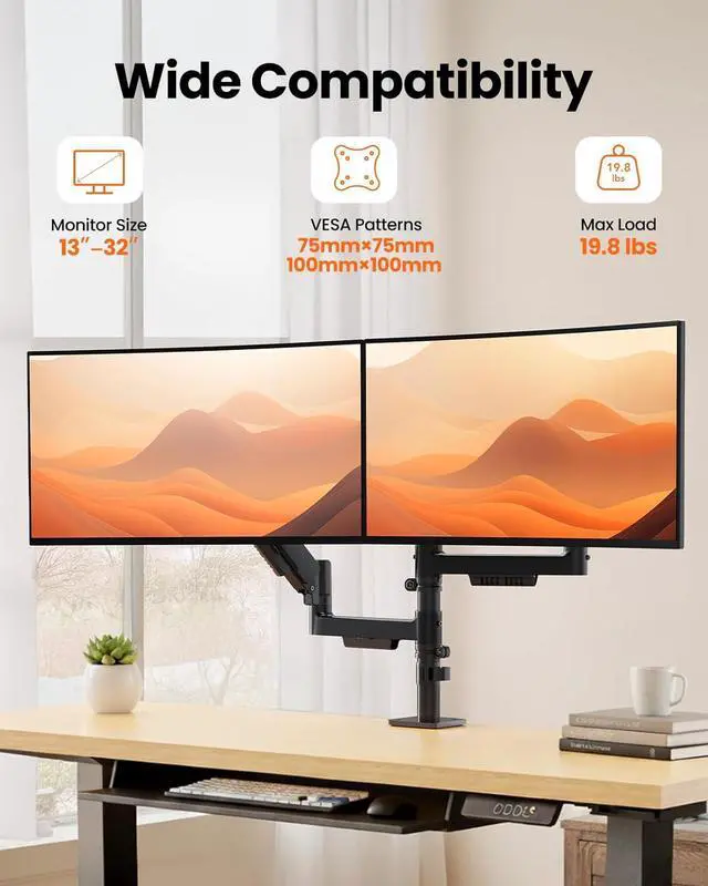 Maximize your workspace with ErGears dual monitor arm. Designed for optimal comfort and flexibility, the dual monitor mount supports two 13-32" monitors, offering independent height and extension adjustments. Enjoy a stable experience, reduce strain, and enhance productivity in an ergonomic setup.