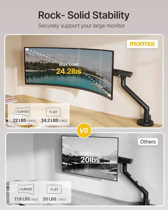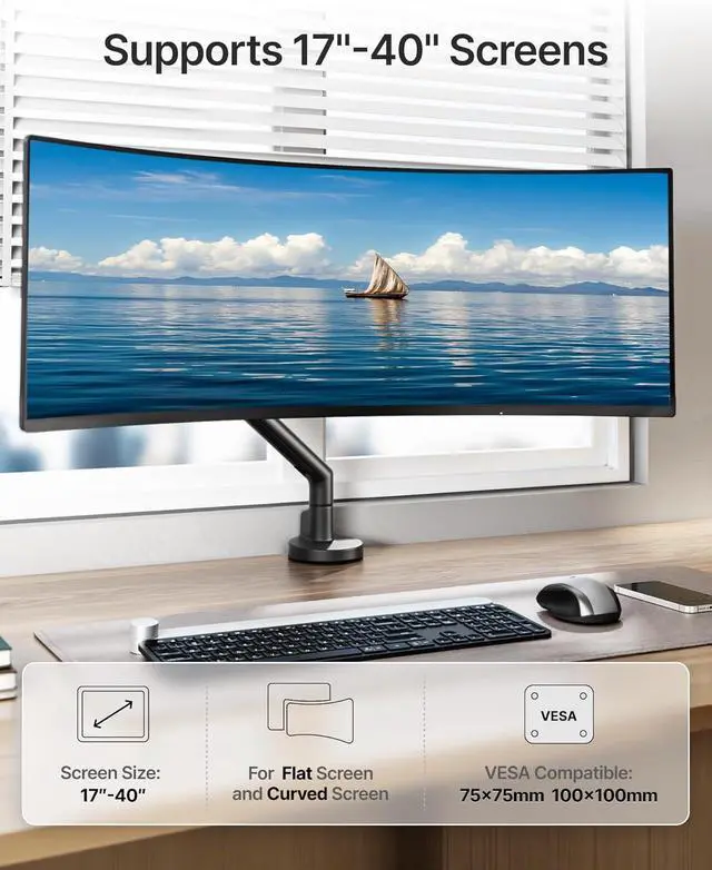 Heavy-Duty Construction, Unshakable Support: Crafted from aerospace-grade aluminum alloy and reinforced steel, this VESA monitor mount delivers rock-solid stability for 17" to 40" screens up to 24.3 lbs (22 lbs for curved displays). Fully compliant with VESA 75x75mm and 100x100mm standards, this VESA mount is built to securely hold your monitor in demanding professional, gaming, and office environments.