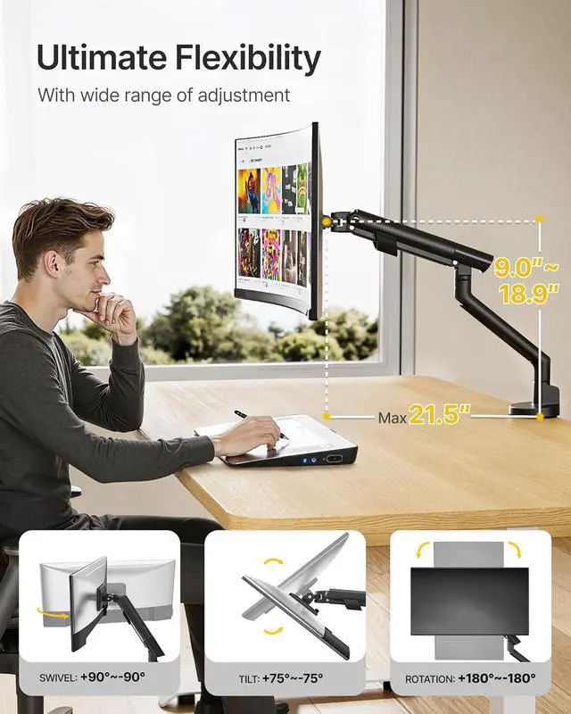 Complete Freedom of MovementThis computer monitor mount offers effortless tilt ±75°, swivel ±90°, and 360°rotation, letting you position your screen for perfect ergonomic comfort. Easily raise your monitor to a healthier height that promotes proper posture, maintains ideal viewing distance, and significantly reduces neck and shoulder strainideal for long workdays or immersive gaming sessions.