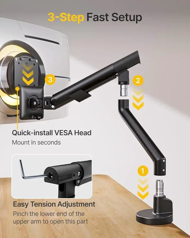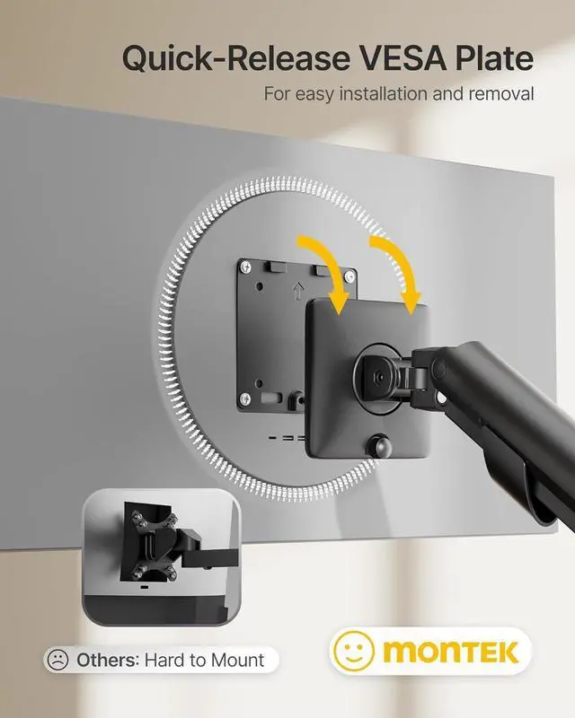 Effortless, Tool-Free Setup for Your Monitor Arm: Forget bending or crawling. Mount the C-clamp or Grommet of your single monitor arm completely from above, then secure your monitor in seconds with the quick-release VESA plate. The entire desk monitor mount is designed for a fast, smooth, and truly one-person installation.