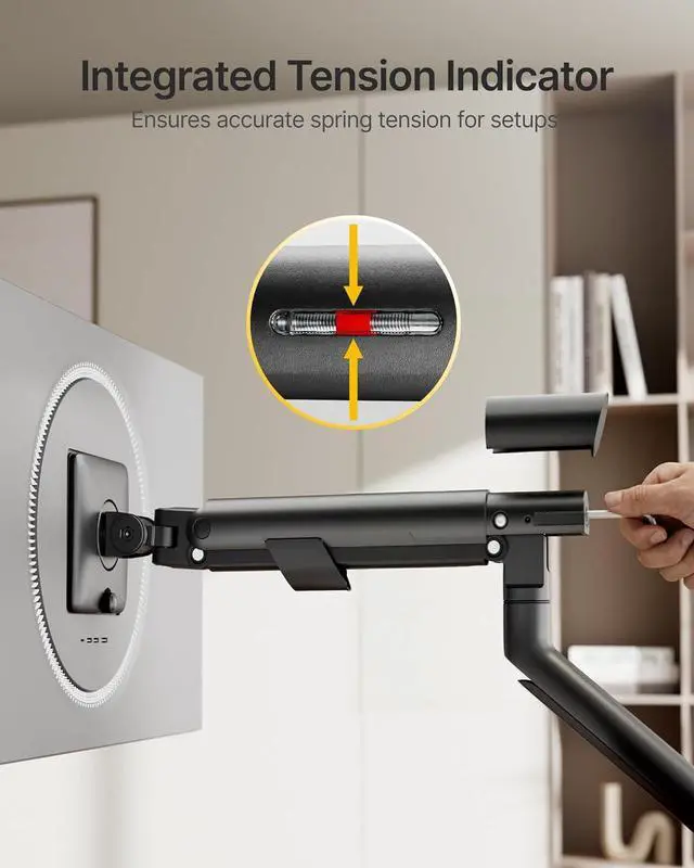 Visual Tension Clear Display: Our monitor mount's unique visual spring tension indicator shows you the exact support level, so you never over tighten or under support your monitor. Every spring is tested over 25,000 cycles for lasting precision. Match the arms strength to your screens weight in seconds and enjoy a flawlessly balanced setup that stays consistent year after year.