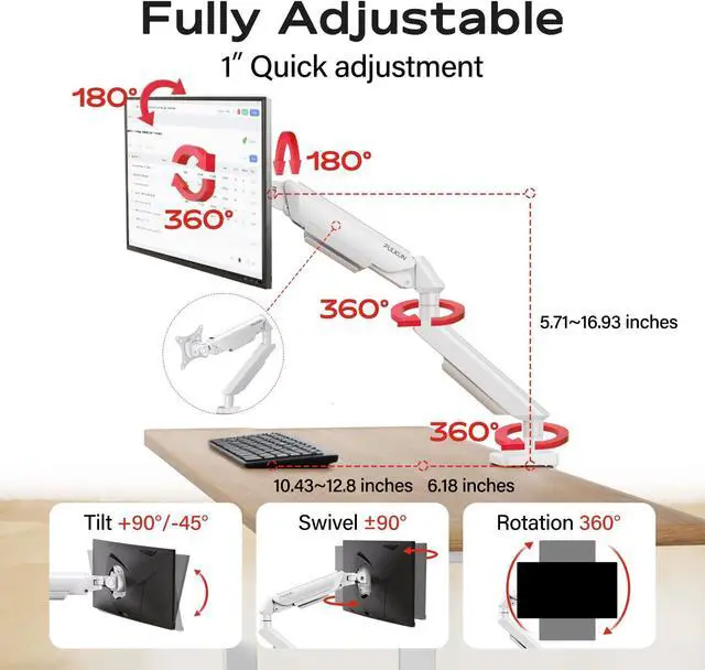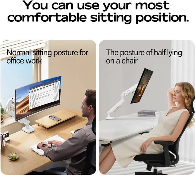 Flexible AdjustmentTilt (+90° to -45°), swivel (180°), and rotate (360°) your screen effortlessly. Ultrawide montior arm with 17.3" height adjustment and 20.5" extension range, it adapts to standing desks, gaming setups, or shared workstationsMeets optimal viewing comfort,work smarter and feel better every day