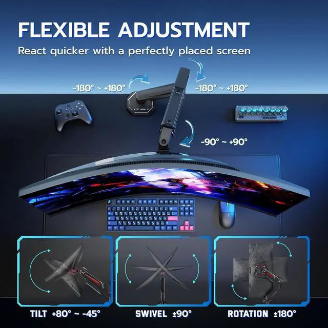 Comfortable Viewing Angle - Features 6.9-16.9 inch height adjustment, 17.9 inch extension range, ±180° rotation, 360° swivel, and -45°/+80° tilt, allowing for easy adjustment and a comfortable viewing angle.