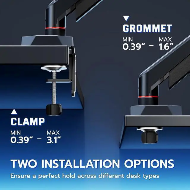 C-Clamp & Grommet Base - It features full VESA compatibility (75x75, 100x100) and offers two versatile installation options C-Clamp (0.39"-3.1" thick desks) or Grommet Mount (0.39"-1.6" thick desks).