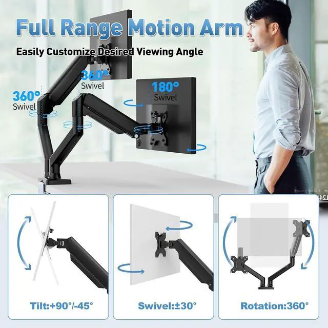 This Dual Monitor Arms Mount for 2 monitors allows smooth swivel capabilities of +90°/-90°, tilt adjustments of +80°/-60°, and a full rotation of 360°, reducing neck and eye strain during long hours of use, Upgrade your workspace with this powerful dual monitor mount!