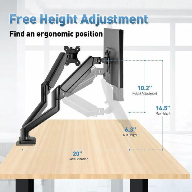 Comfort Is Fundamental - Our dual monitor arm for desk raises monitors to eye level, improving posture, relieving strain on neck & shoulders while increasing productivity levels.Height adjustable, full motion design lets you work in a more comfortable ergonomic position.
