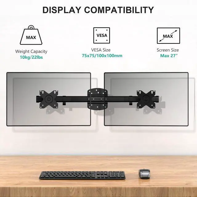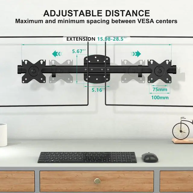 Compatibility: The computer wall mount fits two monitors up to 27, support weight up to 10kg/22lbs per arm, and Mounting Holes 75x75mm to 100x100mm. The adjustable distance between two Mounting Holes plates is 40.6 to 72.4 cm (16 to 28.5 inch). (Note: With wall mounted, the tilt and swivel function will be more limited)