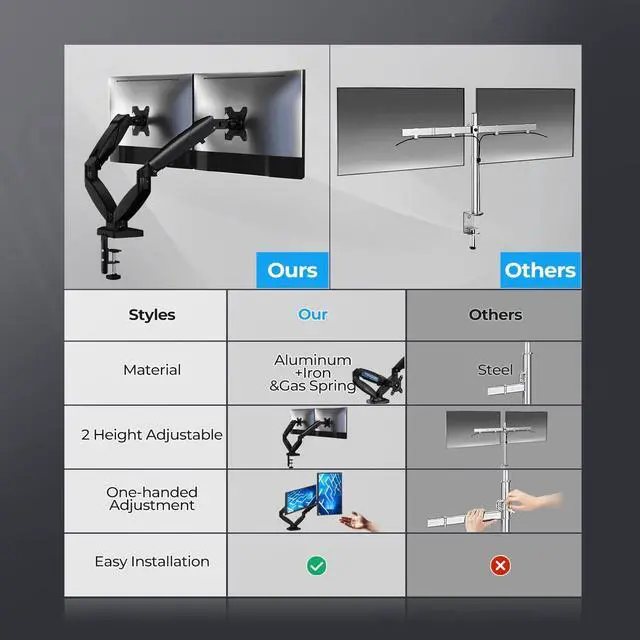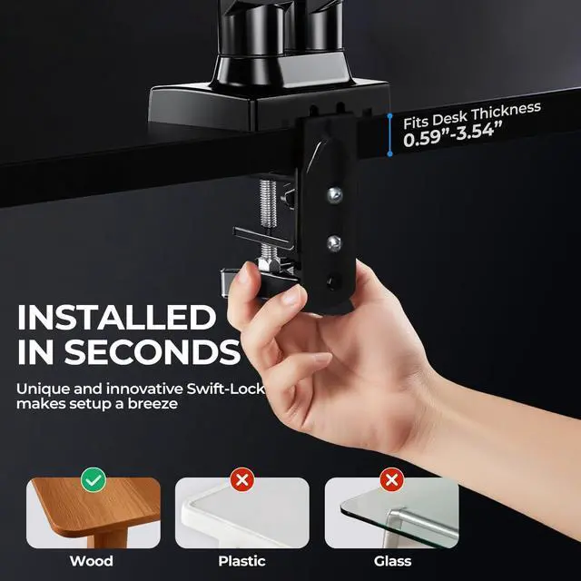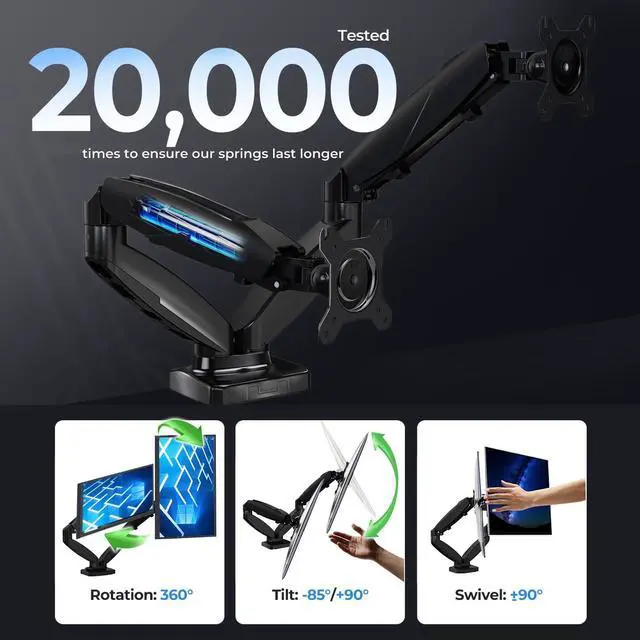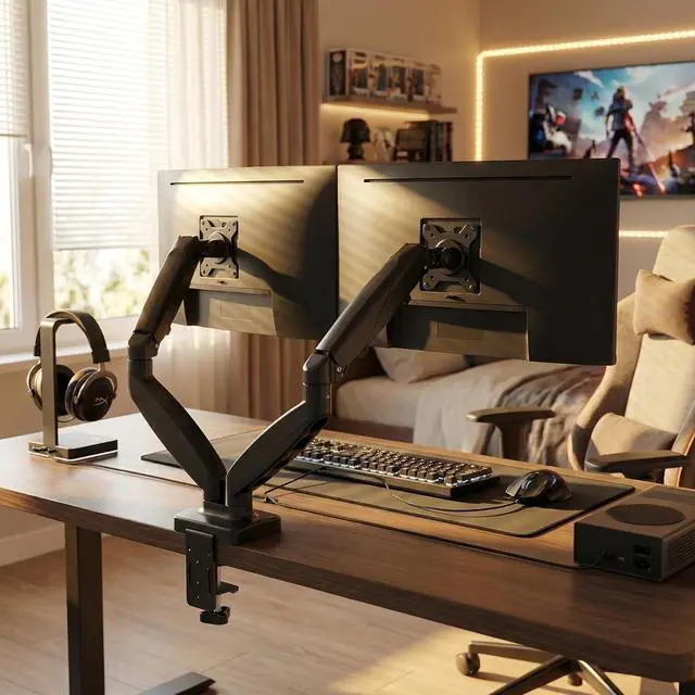 Enhance your workspace with our dual monitor arm featuring full motion VESA mounts. Perfect for 17-32 inch screens, it offers flexible positioning and easy C-clamp mounting. Ideal for creating an ergonomic setup in dorms or study areas.