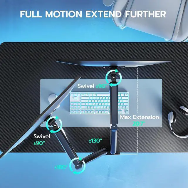Ergonomic Viewing AnglesCustomize your setup with 17.63" height adjustment, 18.4" extension range, ±180° swivel, 360° rotation, and +90°/-90° tilt. Achieve eye-level alignment effortlessly.