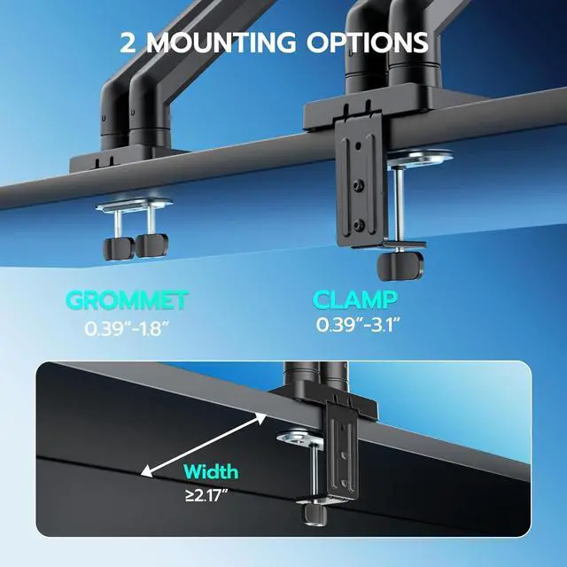 C-Clamp & Grommet BaseIt features full VESA compatibility (75x75, 100x100) and offers two versatile installation options C-Clamp (0.39"-3.15" thick desks) or Grommet Mount (0.39"-1.77" thick desks).
