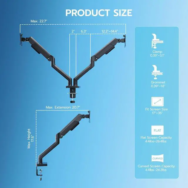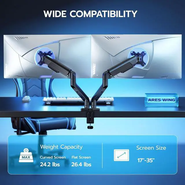 Durability and StrengthAres Wing dual Monitor arms supports up to 26.5 lbs and fits 17-35 inch ultrawide curved screens displays, ideal for gaming setup and office workstation. Its internal mechanical spring undergoes 25,000+ fatigue tests, ensuring long-lasting stability for heavy-duty use.