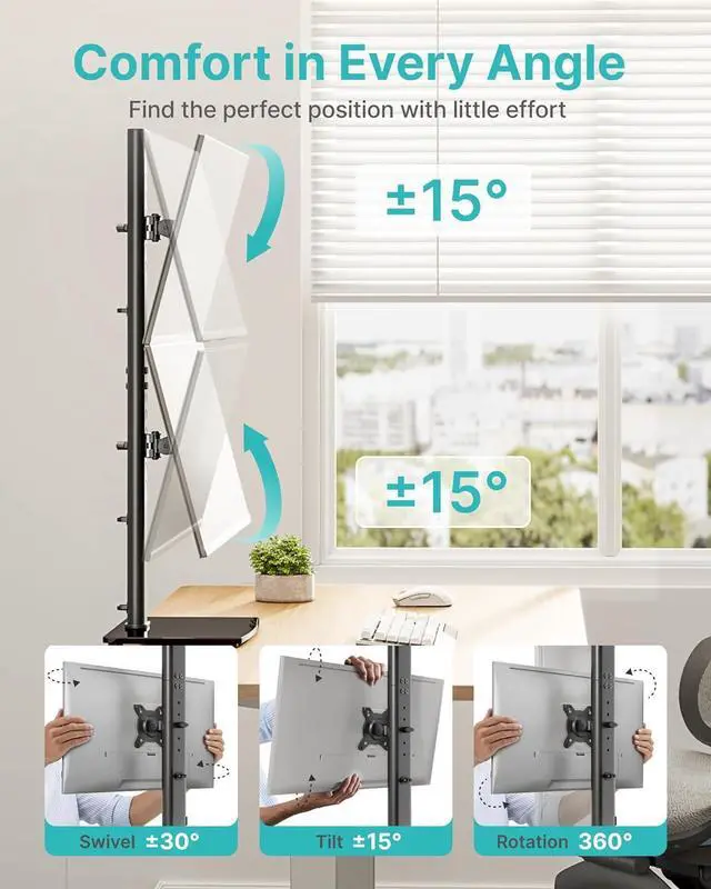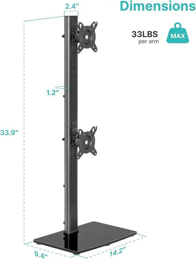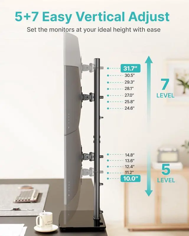 12 Flexible Height AdjustmentWith an 33.3" pole, the upper monitor adjusts from 24.6"31.7" (7 height levels) and the lower monitor from 10"14.8" (5 height levels), allowing you to customize screen height to fit your posture and workflow.
