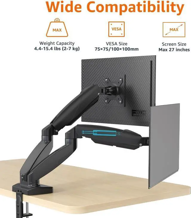 Dual Monitor Desk Mount: Accommodates two LCD LED screens from 15 to 27 inches; articulating gas spring monitor arm provides a space-efficient solution for dual monitor setups