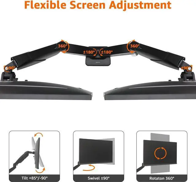 Reliable Support: Supports computer monitors of varying weights from 4.4-15.4 pounds. Instructions for infinite adjustment of the gas spring arm: Pre-set for 15.4 pound monitors. Adjust weight support by rotating in the "-" direction (clockwise): 7 turns to 13.2 pounds, 12 turns to 11 pounds, 16 turns to 8.8 pounds, 19 turns to 5.5 pounds. These values are for reference. Adjust based on your actual experience and ensure the result meets your needs.