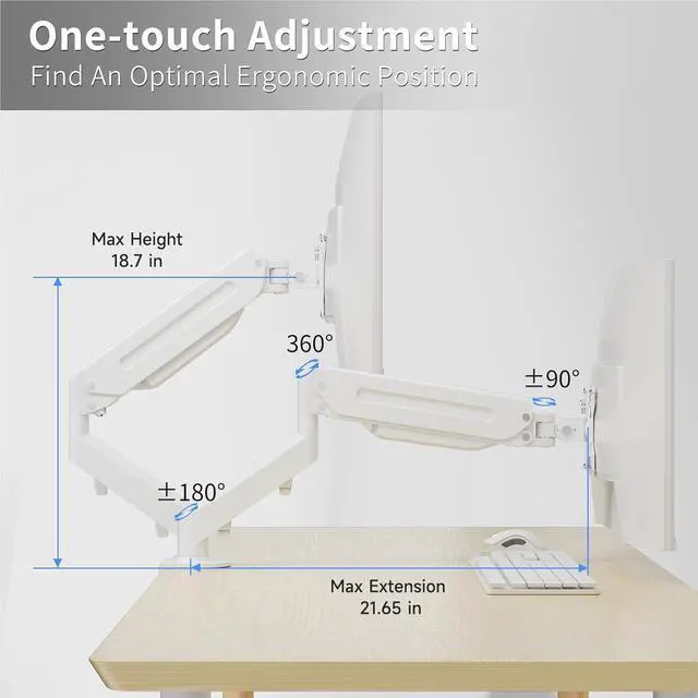 Upgraded-Flexible Gas Spring Arm: The monitor mount with a gas spring system tested 30,000 times to ensure long-lasting performance for your workspace. The monitor arm can extend up to 21.65" long. The height can be adjusted according to the + and - signs on the gas spring arm of the stand, with a maximum height of 18.7 inches. Our monitor arm can be adjusted to the best position that suits your sitting or standing style, improving your posture for productive work