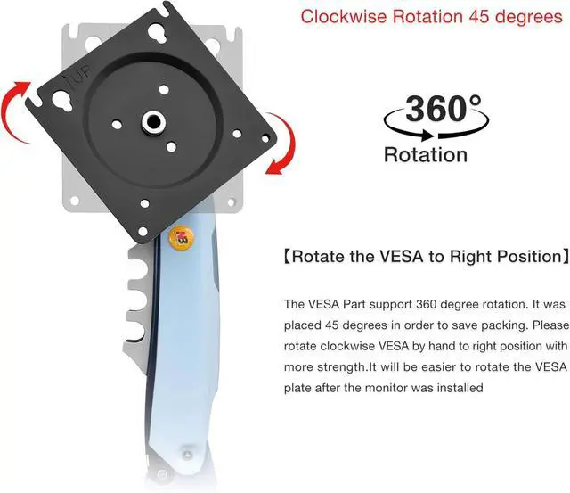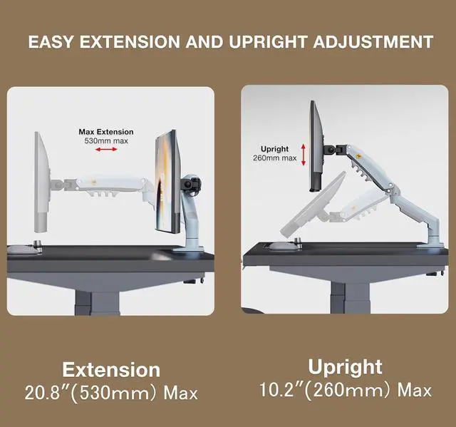 Full motion and more Adjustable: The monitor can be rotated and tilted effortlessly in any direction, Tilt Angel from -30 degrees to +85 degrees with a combined 360 degree VESA Part Rotations, Upright range is 10''(260 mm) with swivel angel ±90 degrees ,Easy positioning of your monitor in any desirable position; Personalize your workstation any way you want