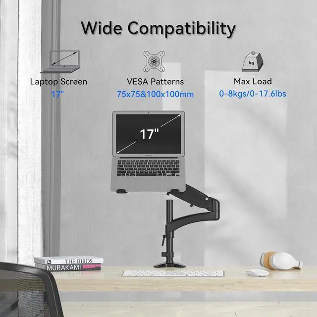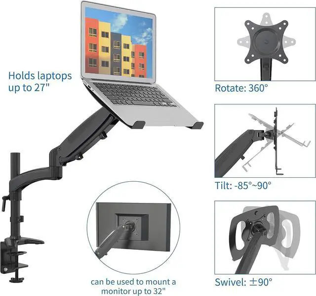 [FITS YOUR LAPTOP OR MONITOR] Hold one 12"-17" laptop that weighs 17.6lb/8kg or less. The arm can also hold one 15"-32" monitor that weighs 17.6lb/8kg or less and has 75mm x 75mm or 100mm x 100mm VESA mounting holes.