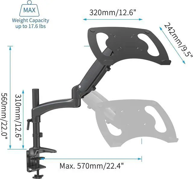 [ULTIMATE ADJUSTMENT RANGE] The laptop arm can extend up to 57cm/22.4inch horizontally from the pole, and raise up to 56cm/22inch vertically from the desk. The VESA head can rotate 360°, tilt -85° to 90°, and swivel 180° giving you the flexible angle and position adjustment.