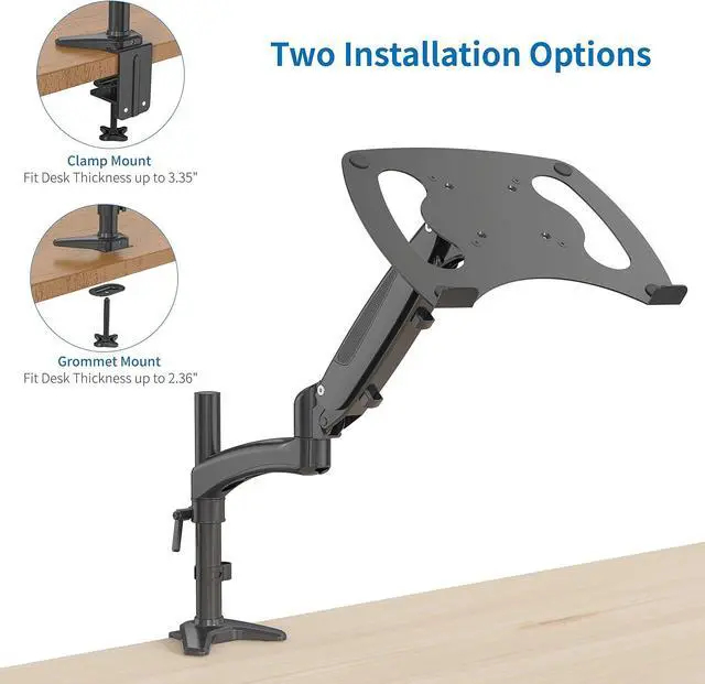 [INSTALLATION OPTIONS] This mount can be installed by C-clamp (max desk thickness 3.35"/85mm) on the edge of the desk OR grommet installation (max desk thickness 2.36"/60mm, suggested hole size 0.3-2.0"/8mm-51mm) for desks with no clearance in the back. Both desk clamp and grommet mounting hardwares included in the box.