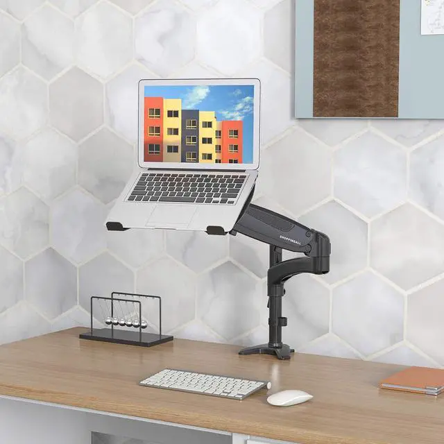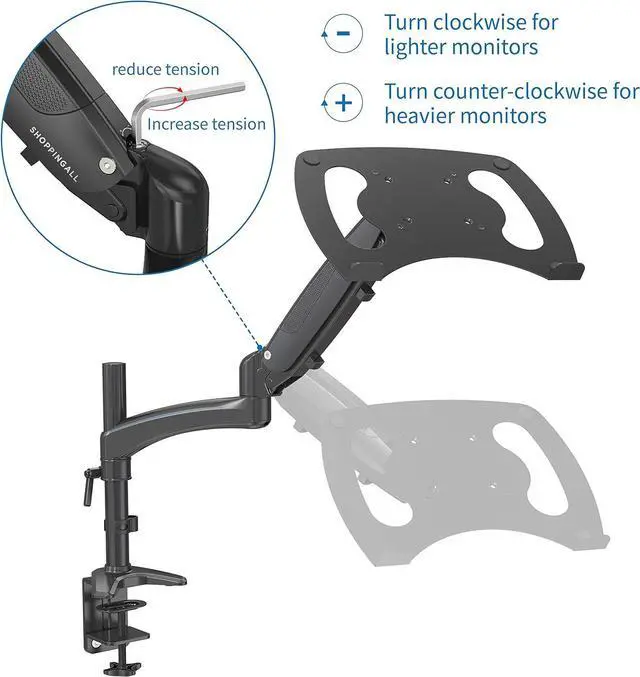 [PNEUMATIC MOVEMENT] Designed with a gas spring system which provides flexible and fluid laptop/monitor motion. The tension on the gas spring arm can be adjusted to best match the weight of laptop or monitor the arm is holding.