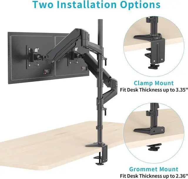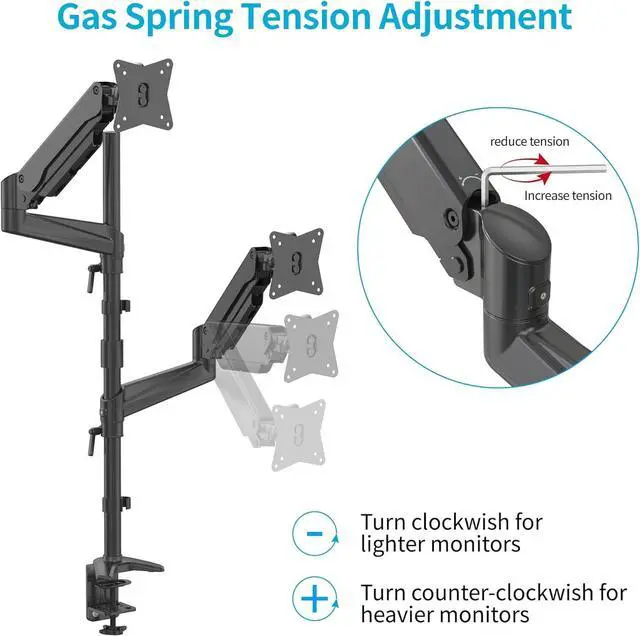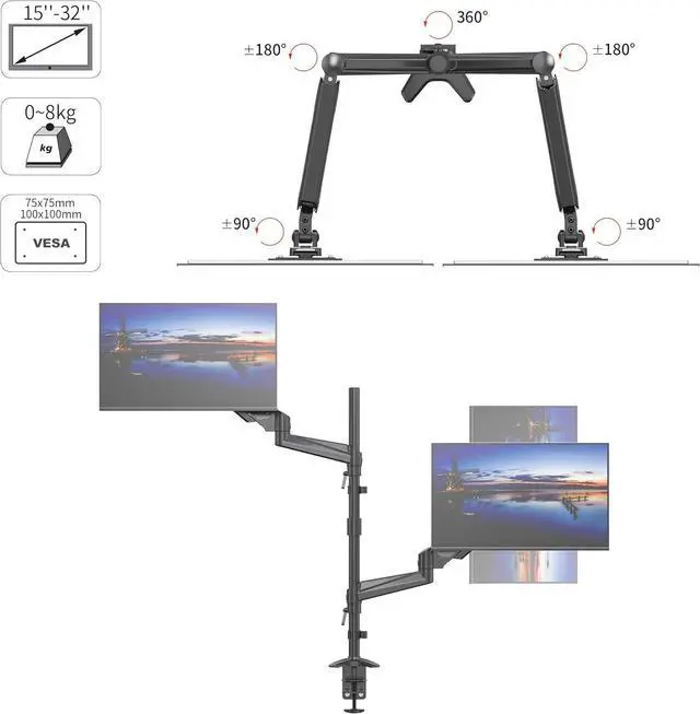 [ENHANCED COMPATIBILITY] Engineered to securely hold two 15"-32" monitors, each arm bears up to 17.6lb/8kg. The mounting arms are compatible with 75mm x 75mm or 100mm x 100mm VESA mounting holes.