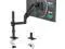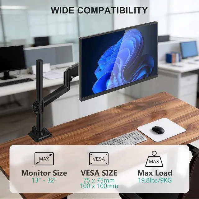 The Single Monitor Arm fits LCD, LED flat screen TV and monitor up to 32". Support up to 19.8 lbs. Mounting Holes fits 75 x 75mm or 100 x 100 mm. The two-stage locking system is design for 2.76 C-clamp and 1.97 Grommet Base.