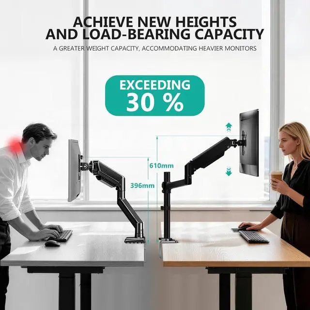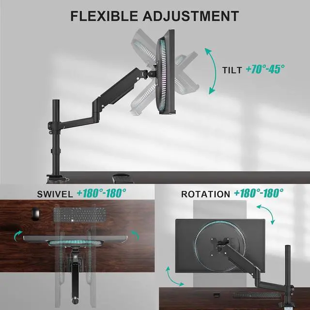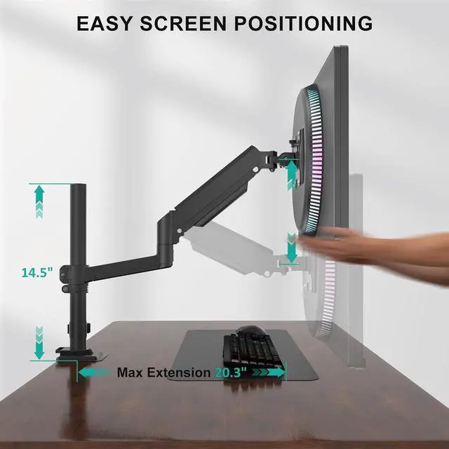 1High Quality2Tension Adjustment3Two Options The gas spring arm easily set your monitor to ergonomic height as per your needs. Thus, relieve the strain on your neck and shoulder and keep you healthy and productive.