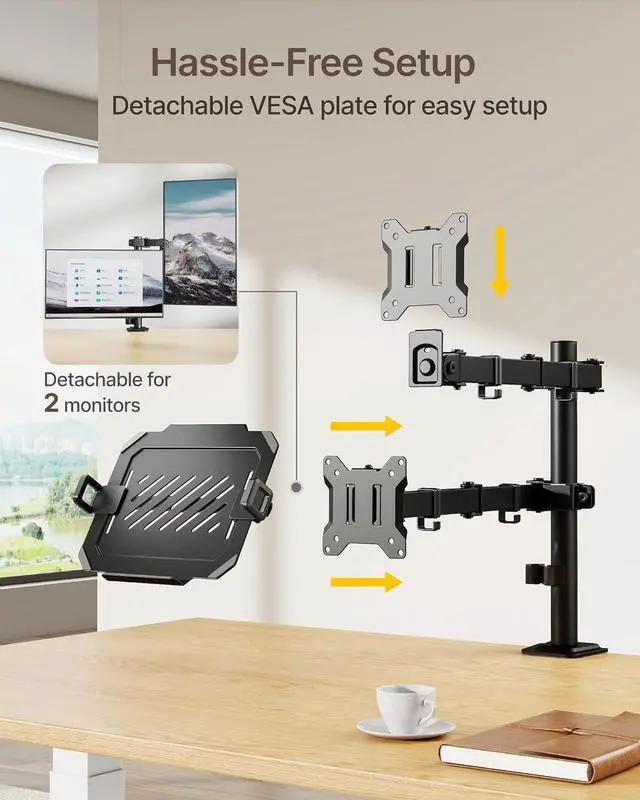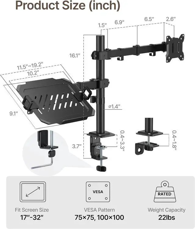 Monitor And Laptop Stand: monTEK monitor stand for desk have two durable monitor arms. One arm fit monitor with max weight 22lbs(10kg) and 17-32 screen which VESA size 75mm*75mm/100mm*100mm, another arm with laptop tray hold 12 - 17 screen and 19.8lbs(9kg) weight laptop.