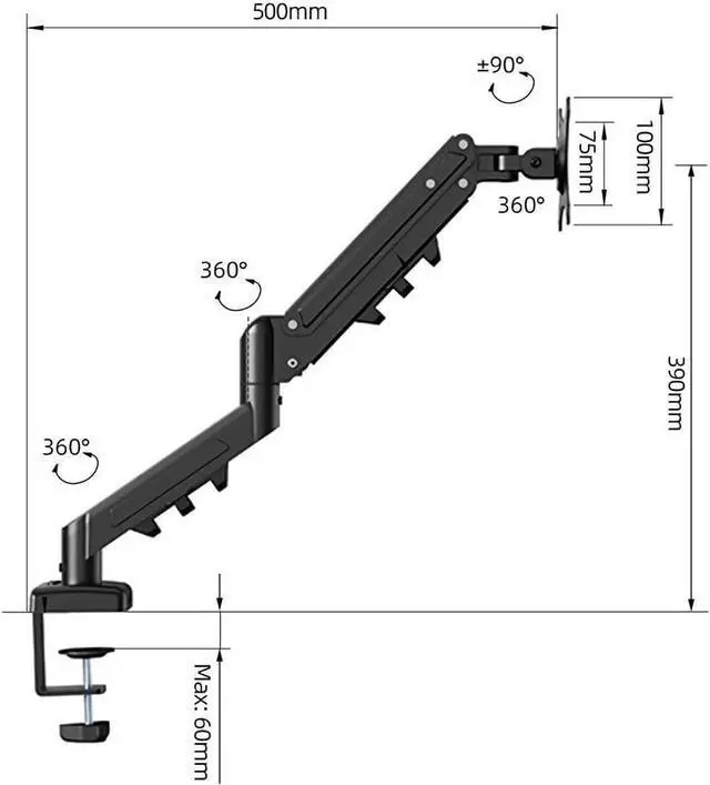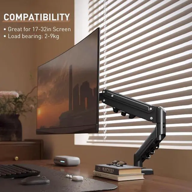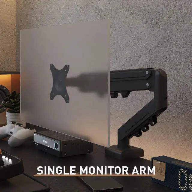 Type: Single Monitor Arm Color: Black Screen Size Compatible: 17-32in Tilt Angle: +85°~-15° Swivel Angle: ±90° Rotation: 360° VESA: 75 x 75mm ,100 x 100mm Weight Capacity:2-9kg Installation: Clamp & Grommet Package 1pc