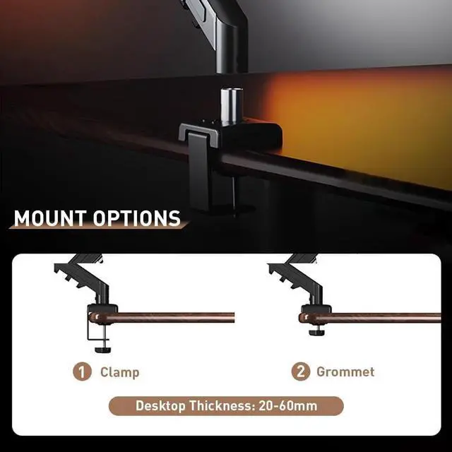 Mount Options: Dual setup with both desk clamp and grommet mount included
