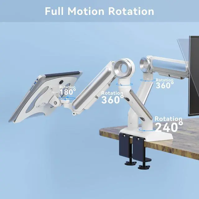 [FULL MOTION] The gas spring arms provide wide range of motion adjustment, 18.5-51cmm/7.3-20.1 height adjustment, 175° tilt, ±180° swivel, and 360° rotation.