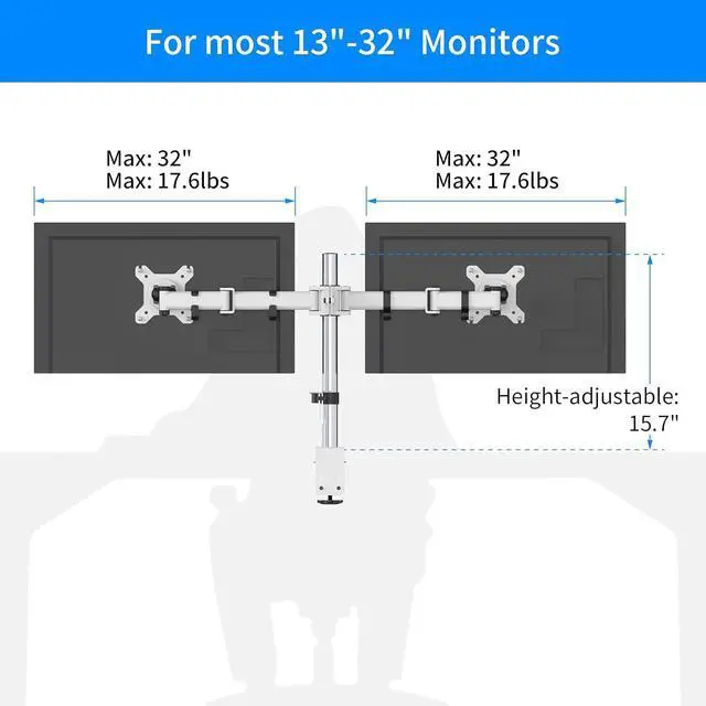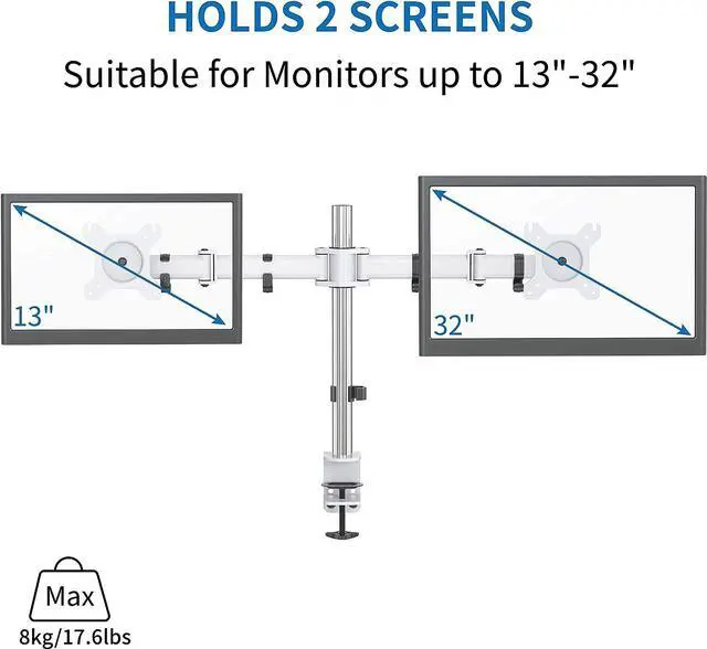 Whether you have two identical monitors or one small monitor and another bigger size monitor. This dual monitor stand SA-D29 will meet your monitor mount needs with full support for almost all 13-32 inch monitors that weigh up to 8kg/17.6lbs.