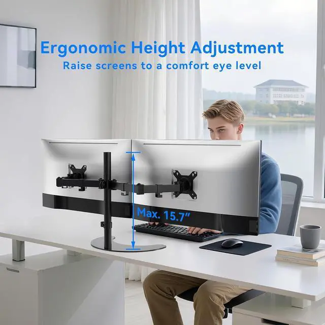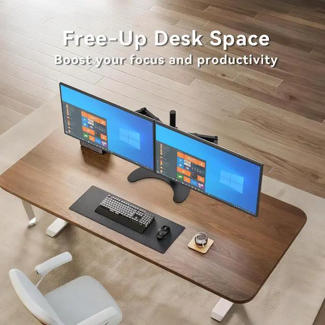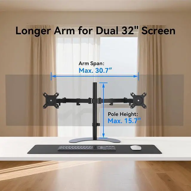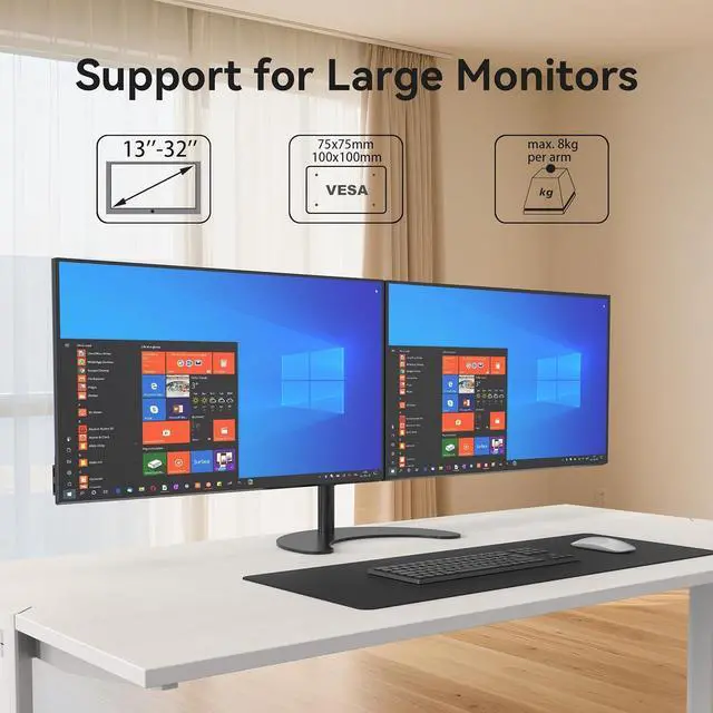 [WIDE COMPATIBILITY] Hold two 13"-32" monitors with 75mm x75mm or 100mm x 100mm VESA mounting holes, supports weight up to 17.6lb/8kg.